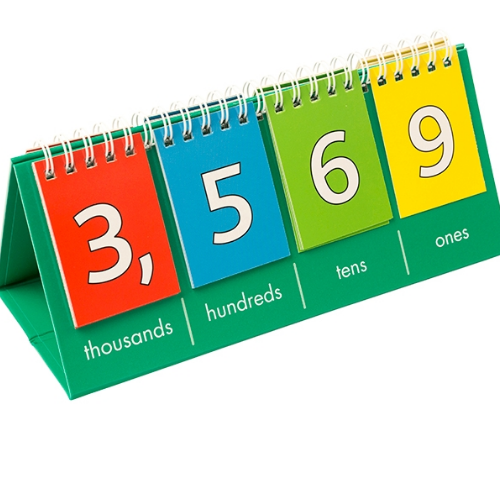 This freestanding flip chart features 4 sets of flips, each with numbers 0-9, one to thousands. Student size Flip Chart 21cm x 9cm.